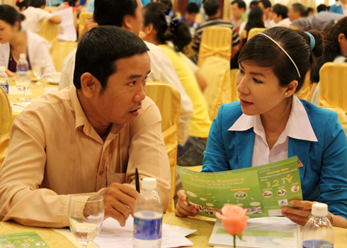 Khách hàng mua nền đất ở Bình Dương, Đồng Nai làm thủ tục với ngân hàng để nhận sổ tiết kiệm do chủ đầu tư và đơn vị phân phối bất động sản khuyến mãi. Ảnh: Vũ Lê.
