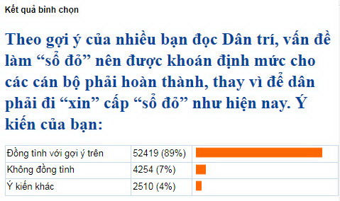 Kết quả thăm dò mới đây trên Dân trí cho thấy, có đến 89% ý kiến của bạn đọc đồng tình với việc khoán định mức cho các cán bộ phải hoàn thành, thay vì để dân phải đi “xin” cấp “sổ đỏ” như hiện nay.