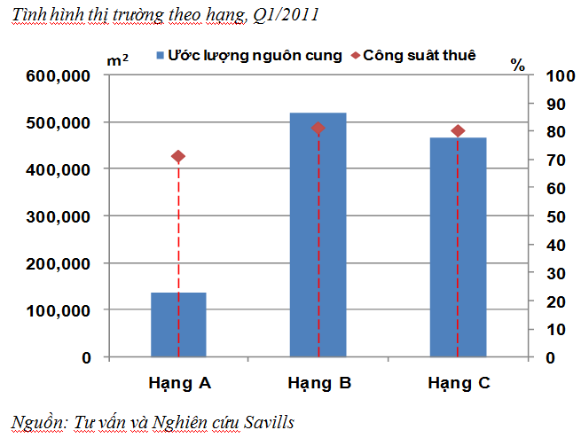Hiện trên thị trường thành phố đang xuất hiện xu hướng khách thuê chuyển từ văn phòng hạng A xuống hạng B và từ hạng B sang hạng C, do đó tỷ lệ lấp đầy phân khúc văn phòng hạng B tăng 45% so với quý trước.